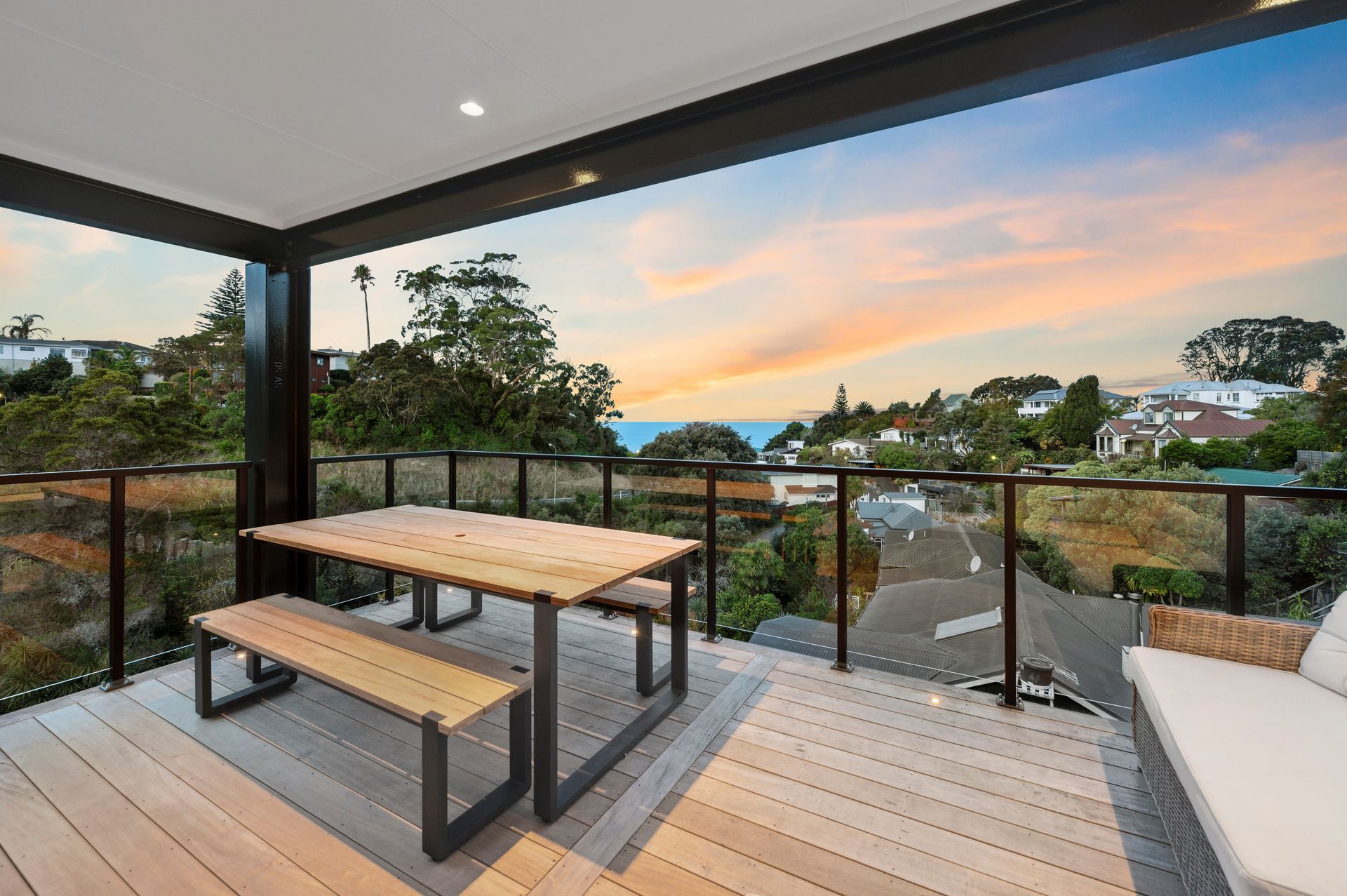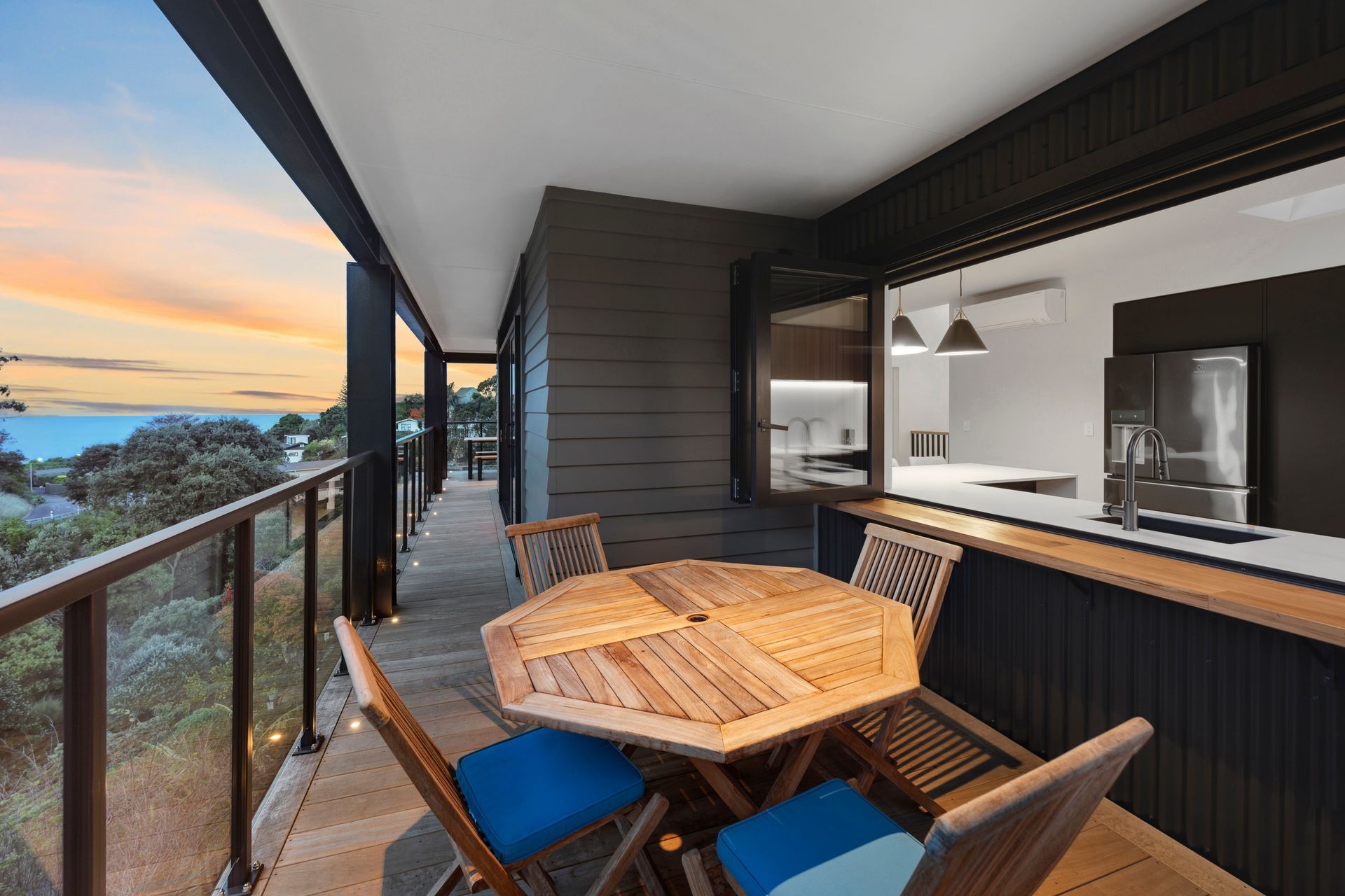 This architecturally designed home on Bluff Hill occupies a steep parcel of land nestled below the road level. It boasts an elevated steel framework, incorporating expansive glass doors across two floors, maximising natural light flow and embracing panoramic views of the nearby bush reserve and ocean. The innovative design yields a four-bedroom home with two living areas and three luxurious bathrooms, all within a modest 178m2 footprint. Sprawling wrap-around decks offer versatile outdoor living options regardless of the wind direction.
